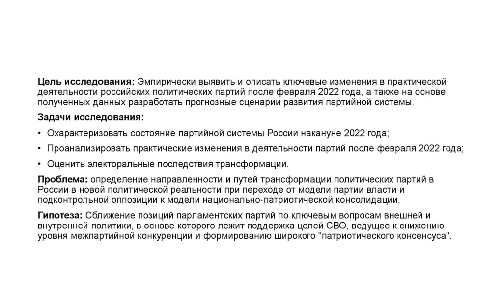 Цель исследования: Эмпирически выявить и описать ключевые изменения в практическойдеятельности российских политических партий после февраля 2022 года, а также на основе