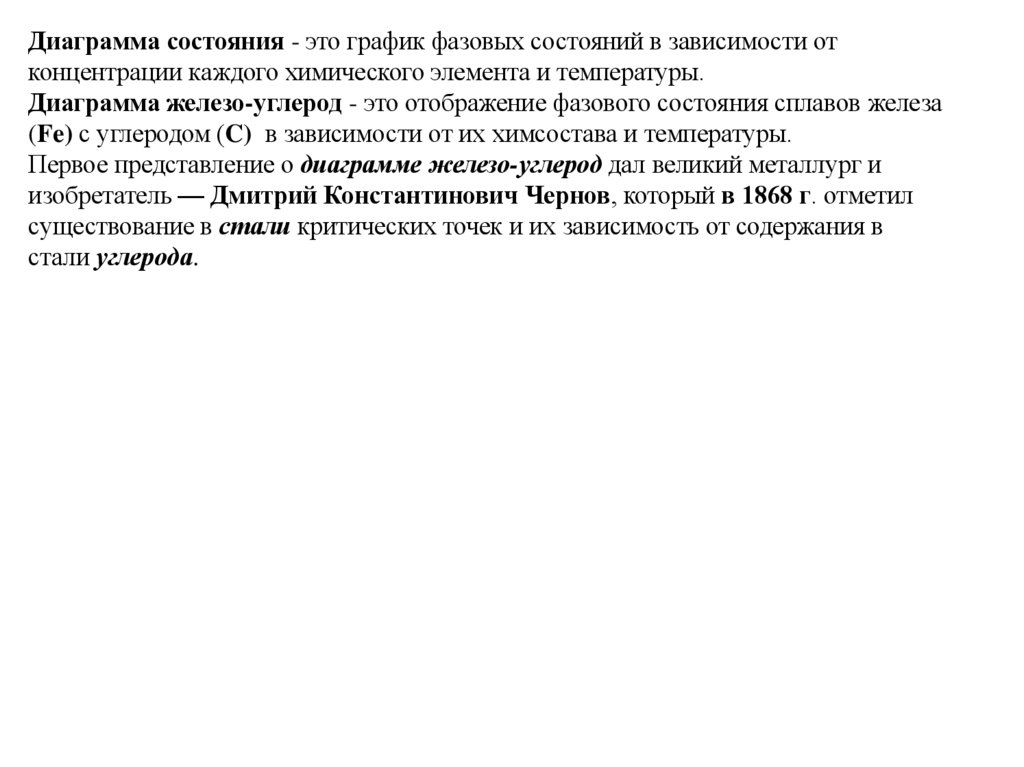 Диаграмма состояния - это график фазовых состояний в зависимости отконцентрации каждого химического элемента и температуры.