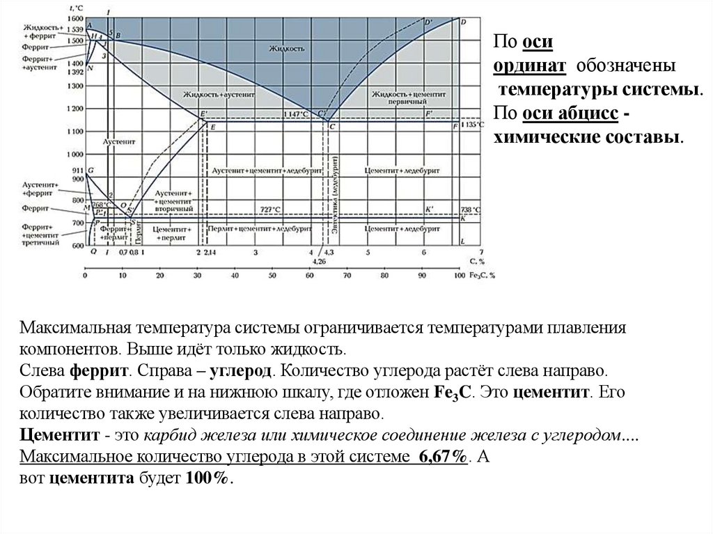 Обратите внимание и на нижнюю шкалу, где отложен Fe3C. Это цементит. Его