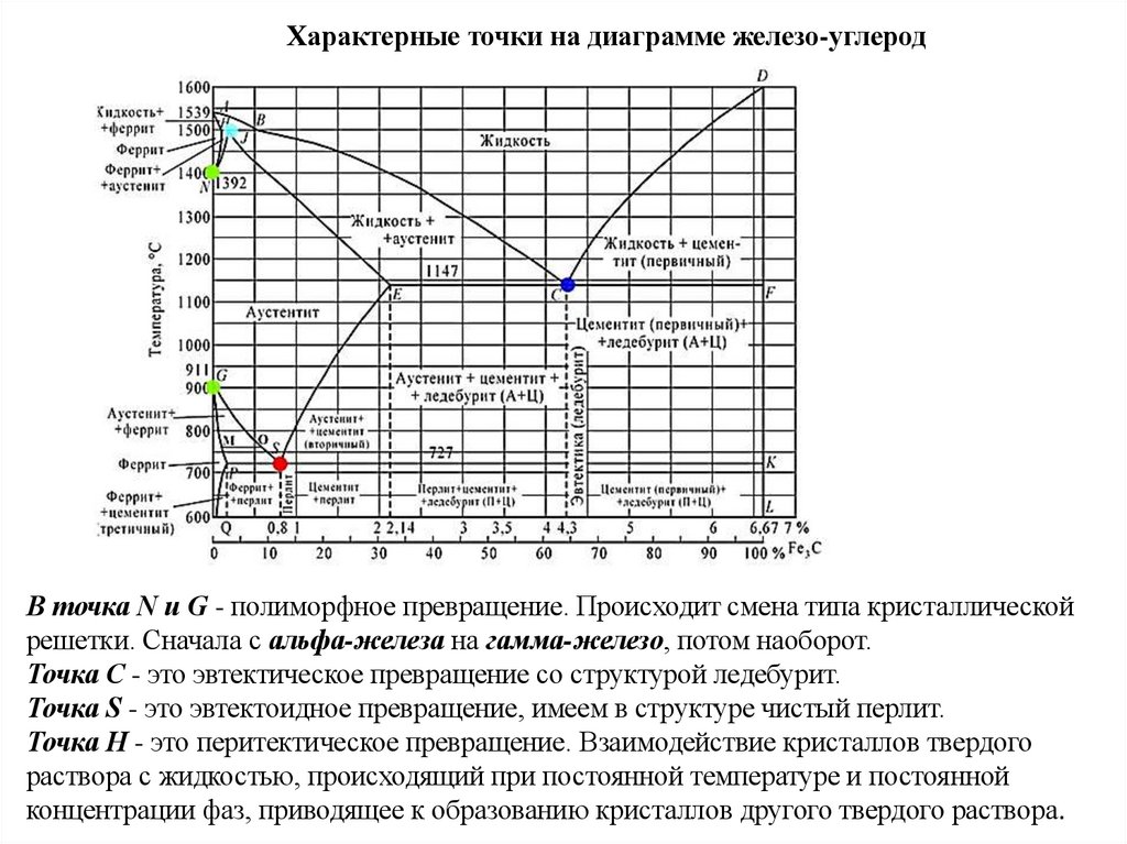 Характерные точки на диаграмме железо-углеродВ точка N и G - полиморфное превращение. Происходит смена типа кристаллической