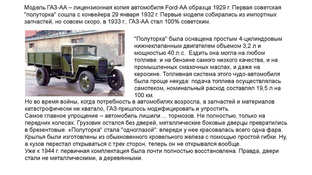 Модель ГАЗ-АА – лицензионная копия автомобиля Ford-АА образца 1929 г. Первая советская"полуторка" сошла с конвейера 29 января 1932 г. Первые модели собирались из импортных