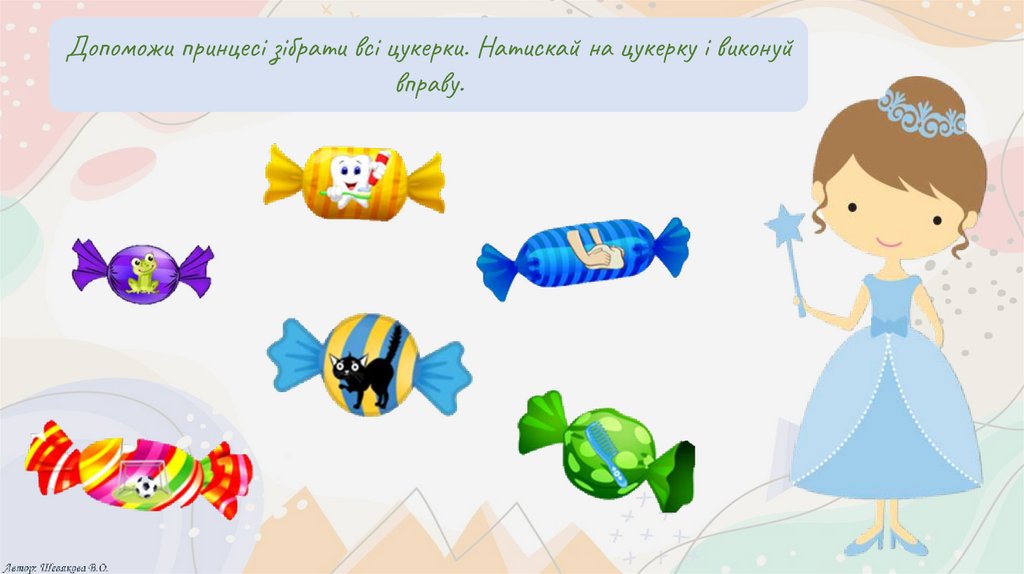 Допоможи принцесі зібрати всі цукерки. Натискай на цукерку і виконуйвправу.