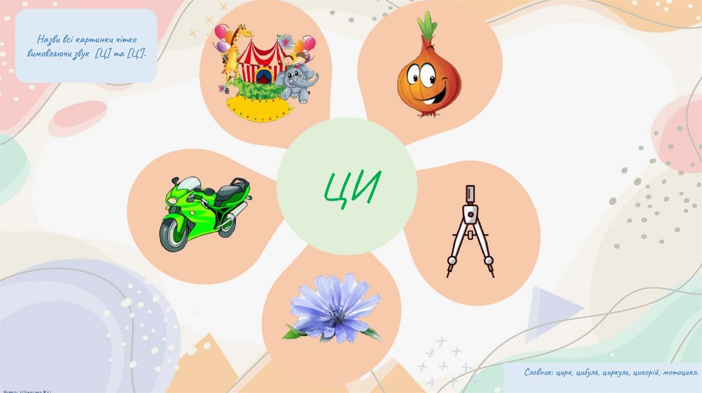 Словник: цирк, цибуля, циркуль, цикорій, мотоцикл.