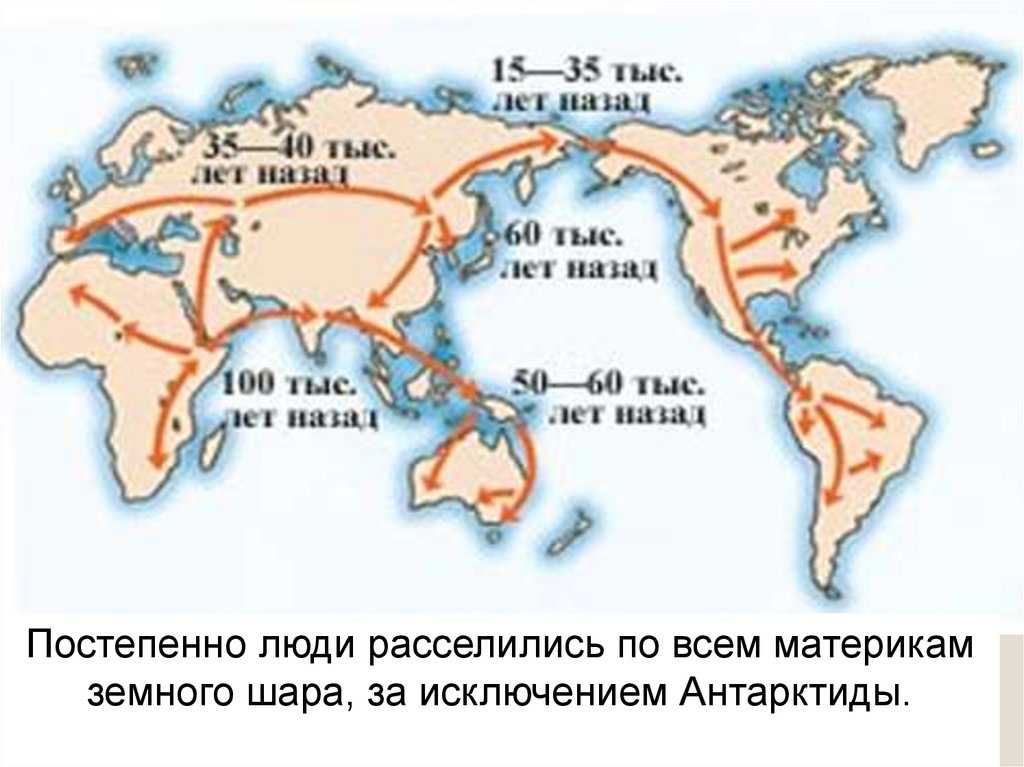 Постепенно люди расселились по всем материкамземного шара, за исключением Антарктиды.