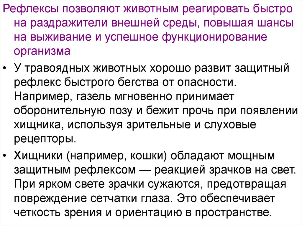 Рефлексы позволяют животным реагировать быстрона раздражители внешней среды, повышая шансы