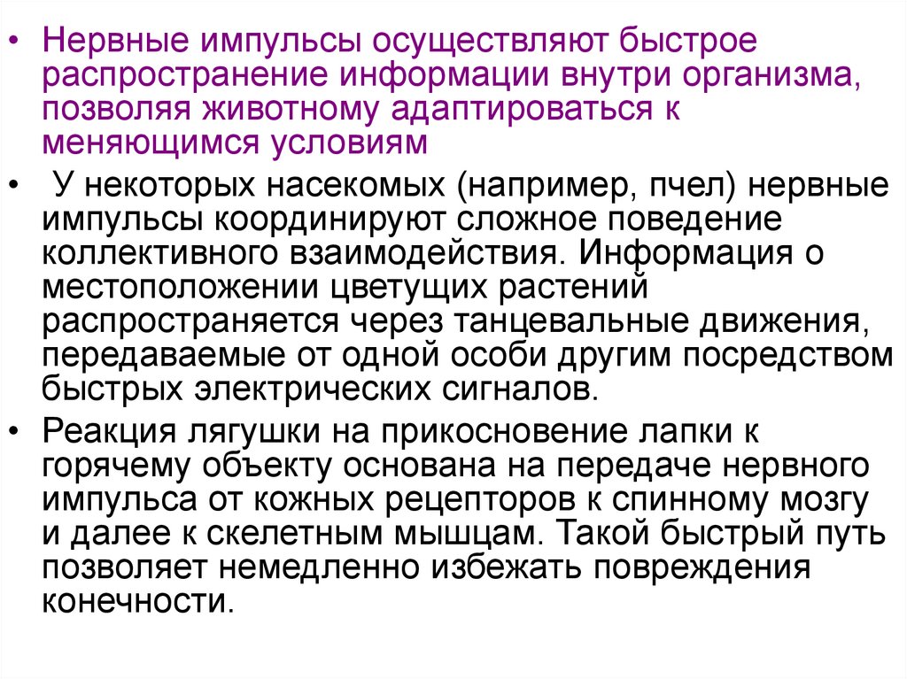 • Нервные импульсы осуществляют быстроераспространение информации внутри организма,