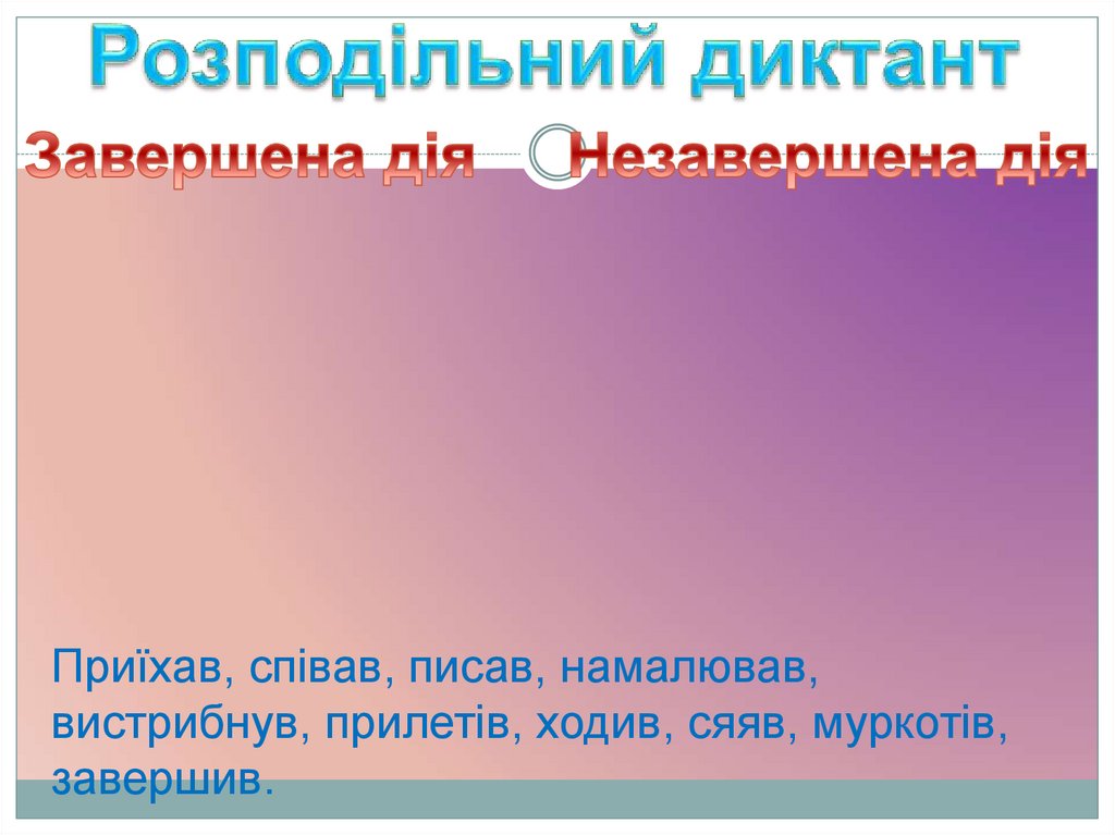 Приїхав, співав, писав, намалював,вистрибнув, прилетів, ходив, сяяв, муркотів,