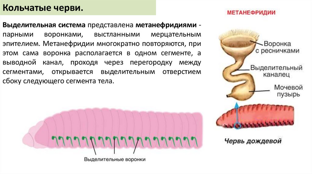 Кольчатые черви.Выделительная система представлена метанефридиями парными воронками, выстланными мерцательным