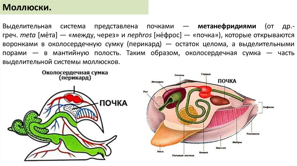 Моллюски.Выделительная система представлена почками — метанефридиями (от др.греч. meta [ме́та] — «между, через» и nephros [не́фрос] — «почка»), которые открываются