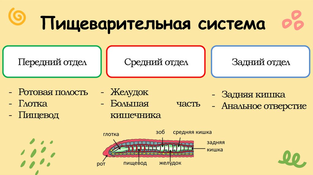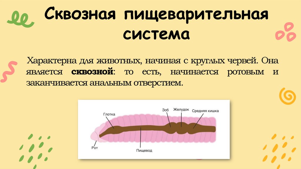 глотку, пищевод, желудок, кишечник и анальное отверстие.