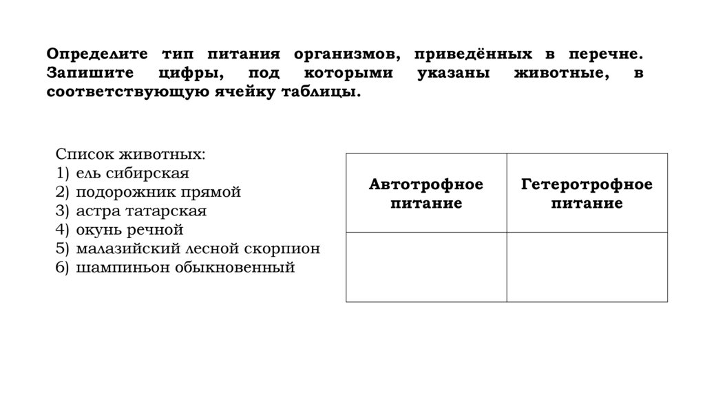 Определите тип питания организмов, приведённых в перечне.Запишите