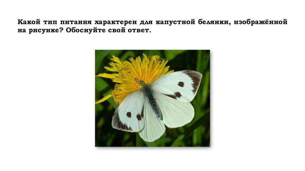 Какой тип питания характерен для капустной белянки, изображённойна рисунке? Обоснуйте свой ответ.