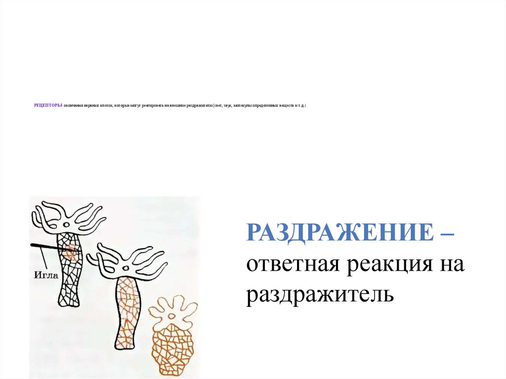 РЕЦЕПТОРЫ- окончания нервных клеток, которые могут реагировать на внешние раздражители (свет, звук, молекулы определённых веществ и т.д.)РАЗДРАЖЕНИЕ –