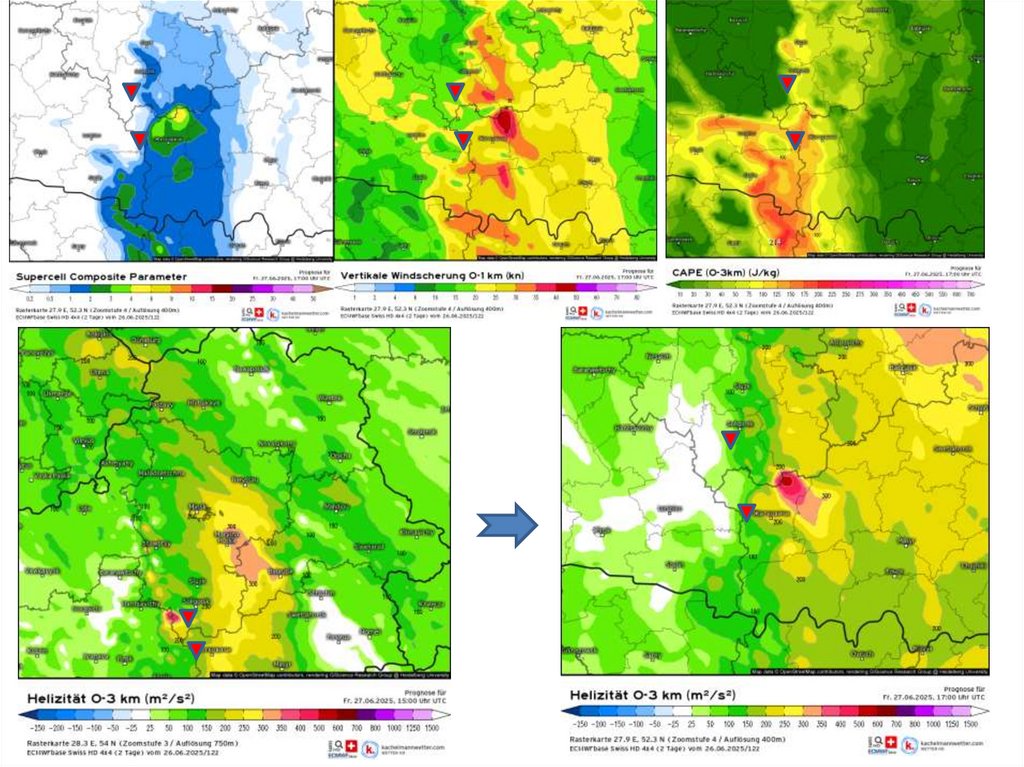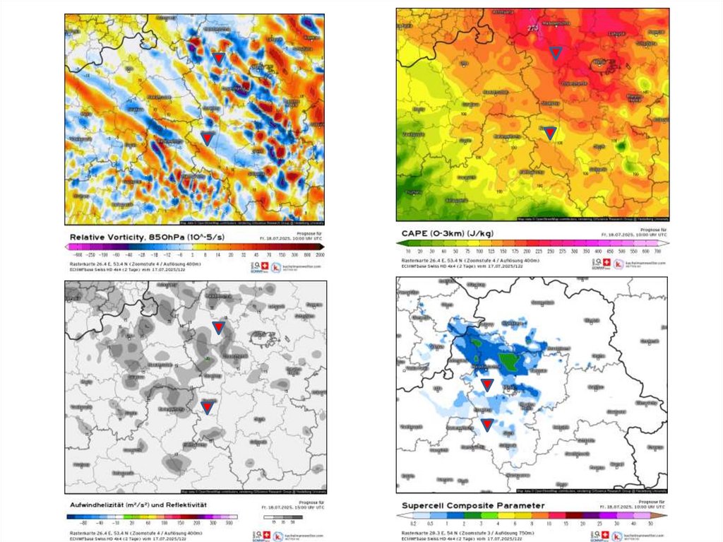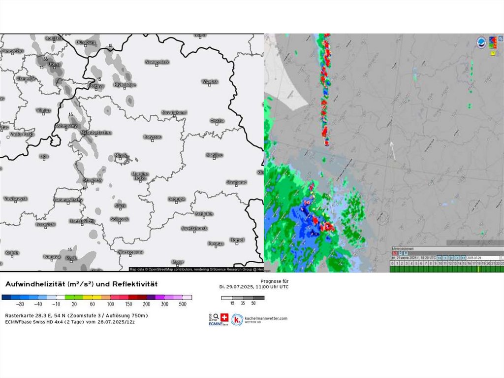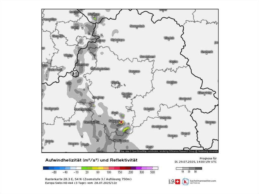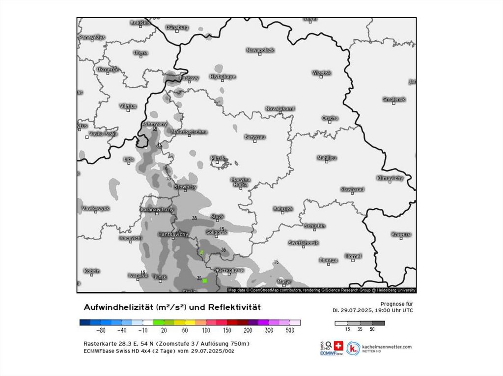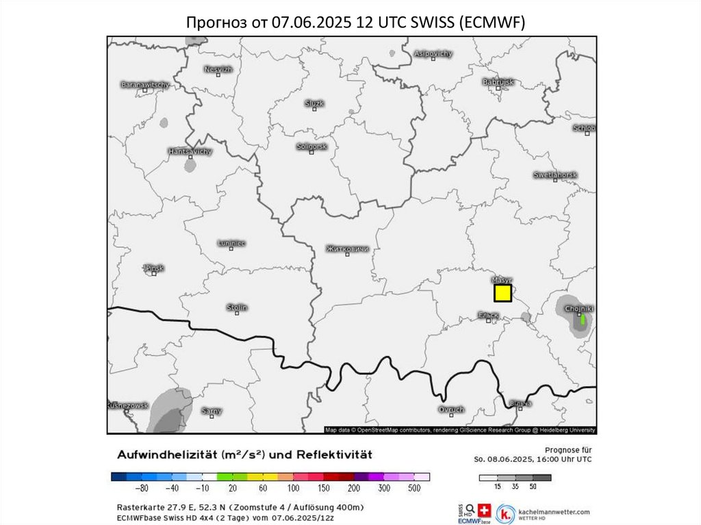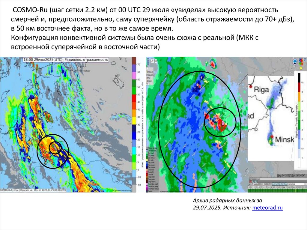 COSMO-Ru (шаг сетки 2.2 км) от 00 UTC 29 июля «увидела» высокую вероятностьсмерчей и, предположительно, саму суперячейку (область отражаемости до 70+ дБз),