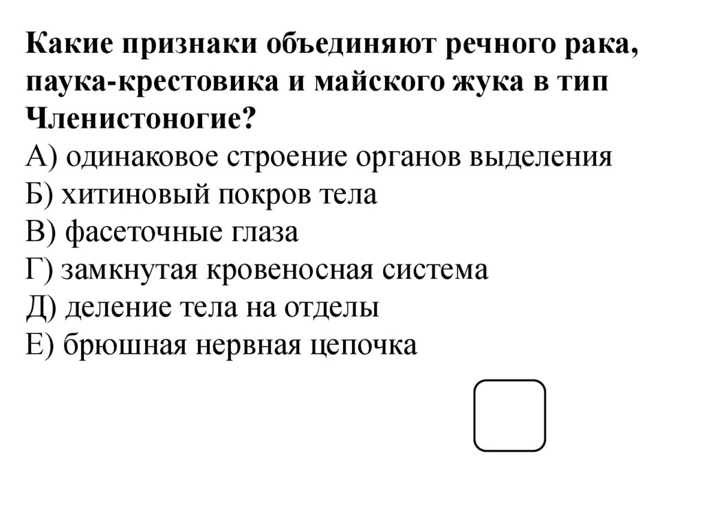 Какие признаки объединяют речного рака,паука-крестовика и майского жука в тип