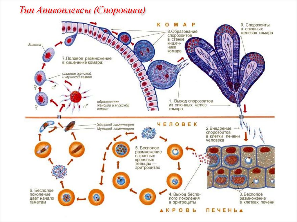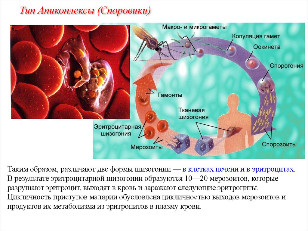 Тип Апикоплексы (Споровики)Таким образом, различают две формы шизогонии — в клетках печени и в эритроцитах.