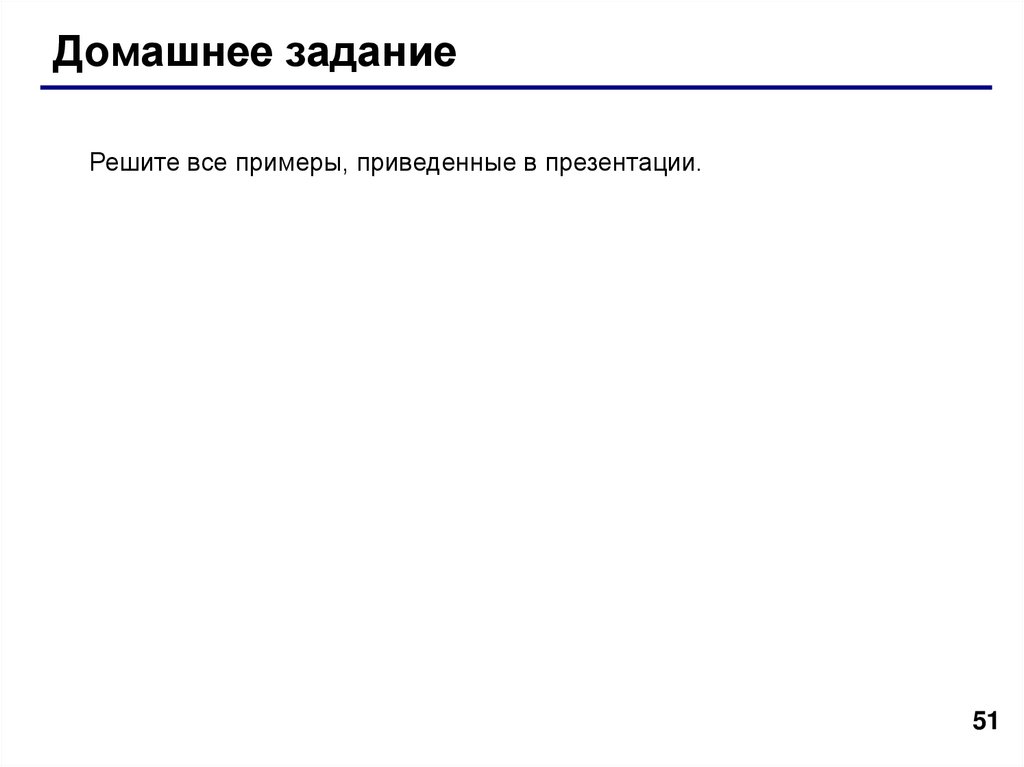 Домашнее заданиеРешите все примеры, приведенные в презентации.