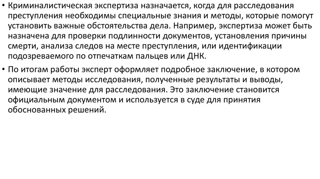 • Криминалистическая экспертиза назначается, когда для расследованияпреступления необходимы специальные знания и методы, которые помогут