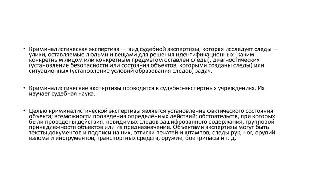 • Криминалистическая экспертиза — вид судебной экспертизы, которая исследует следы —улики, оставляемые людьми и вещами для решения идентификационных (каким