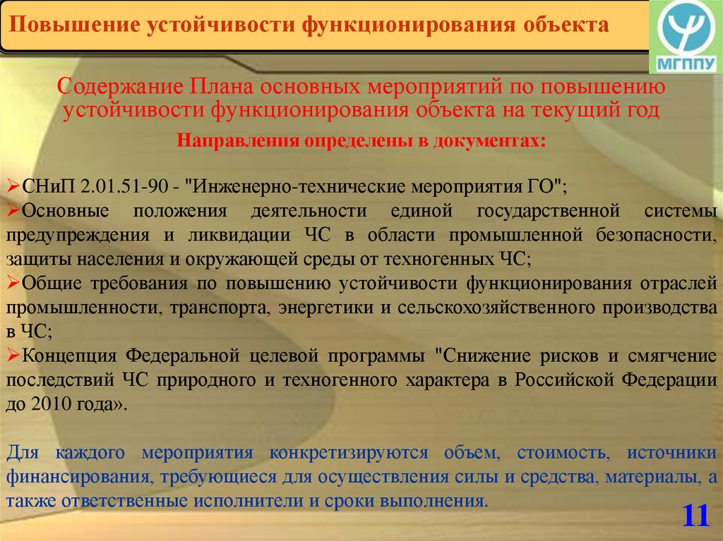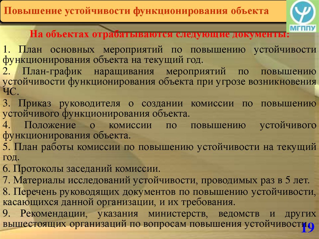Повышение устойчивости функционирования объектаНа объектах отрабатываются следующие документы: