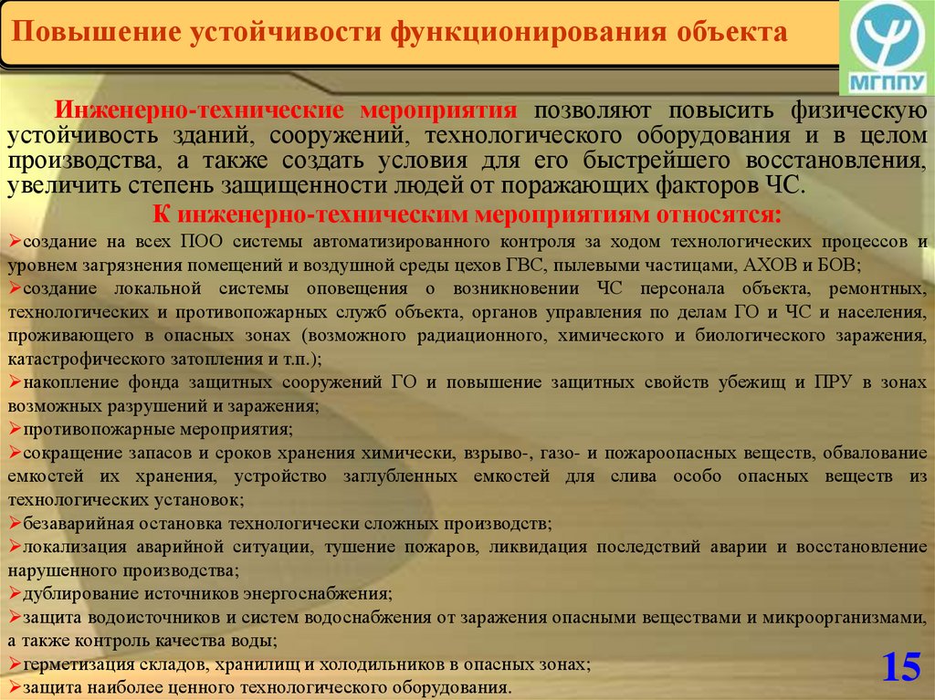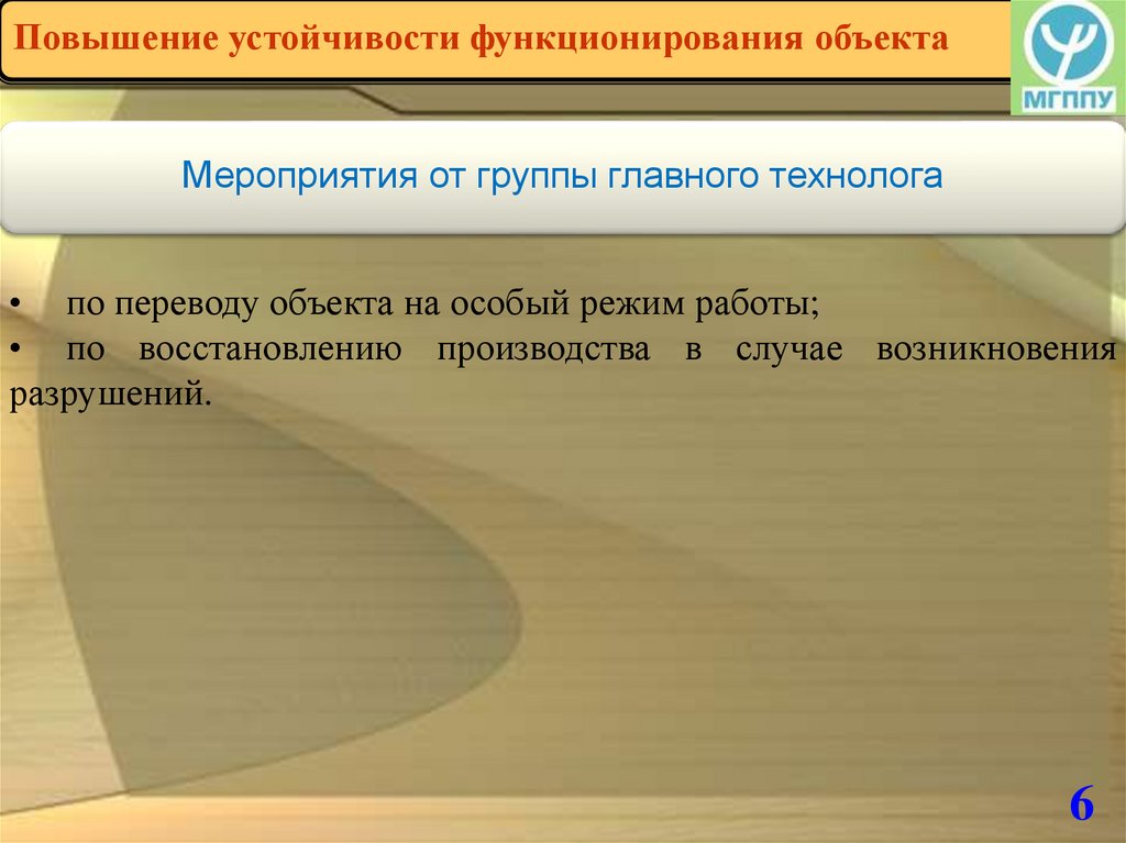 Повышение устойчивости функционирования объектаМероприятия от группы главного технолога