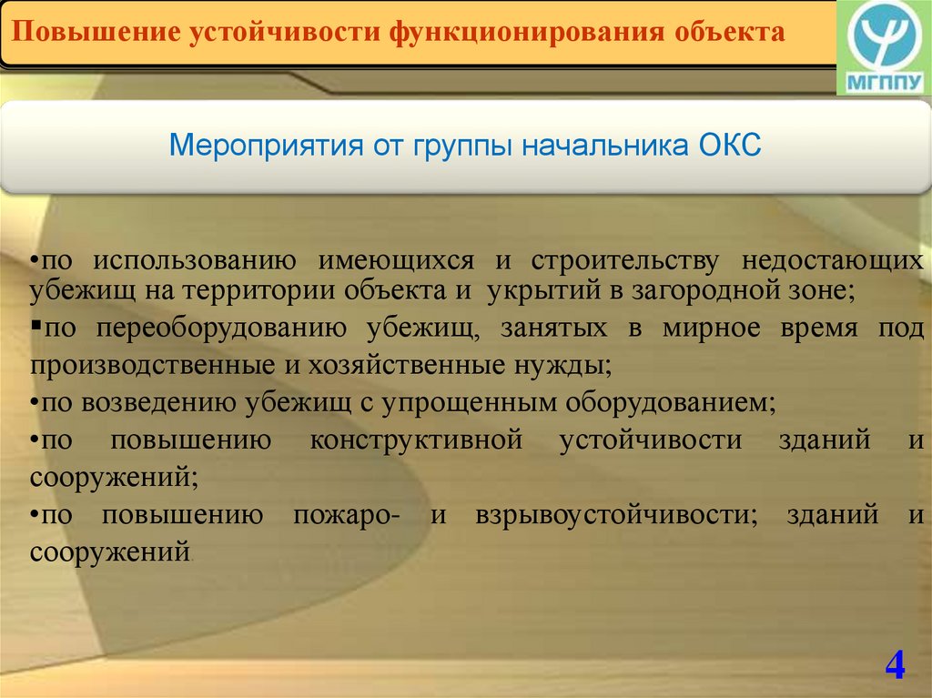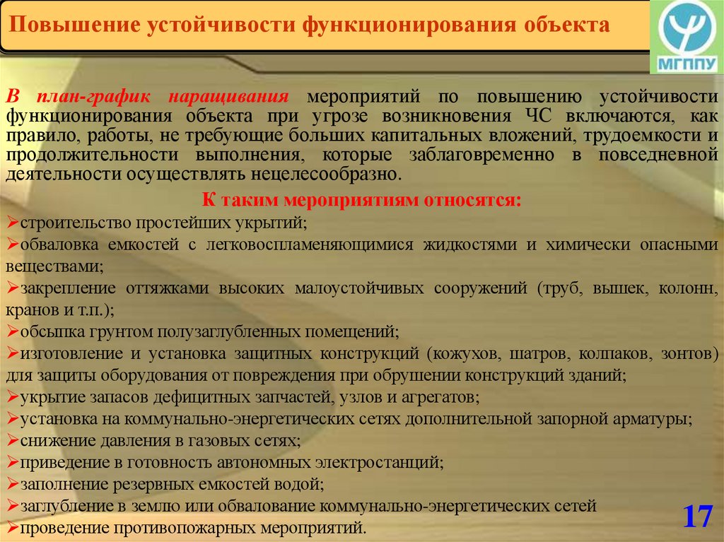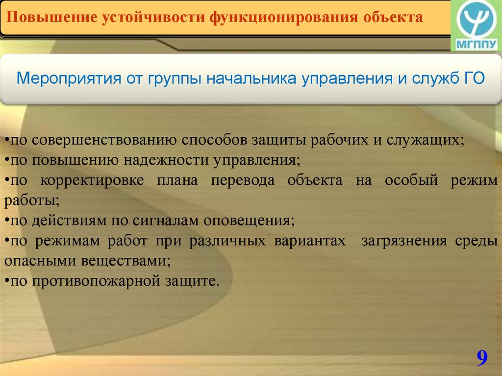 Повышение устойчивости функционирования объектаМероприятия от группы начальника управления и служб ГО