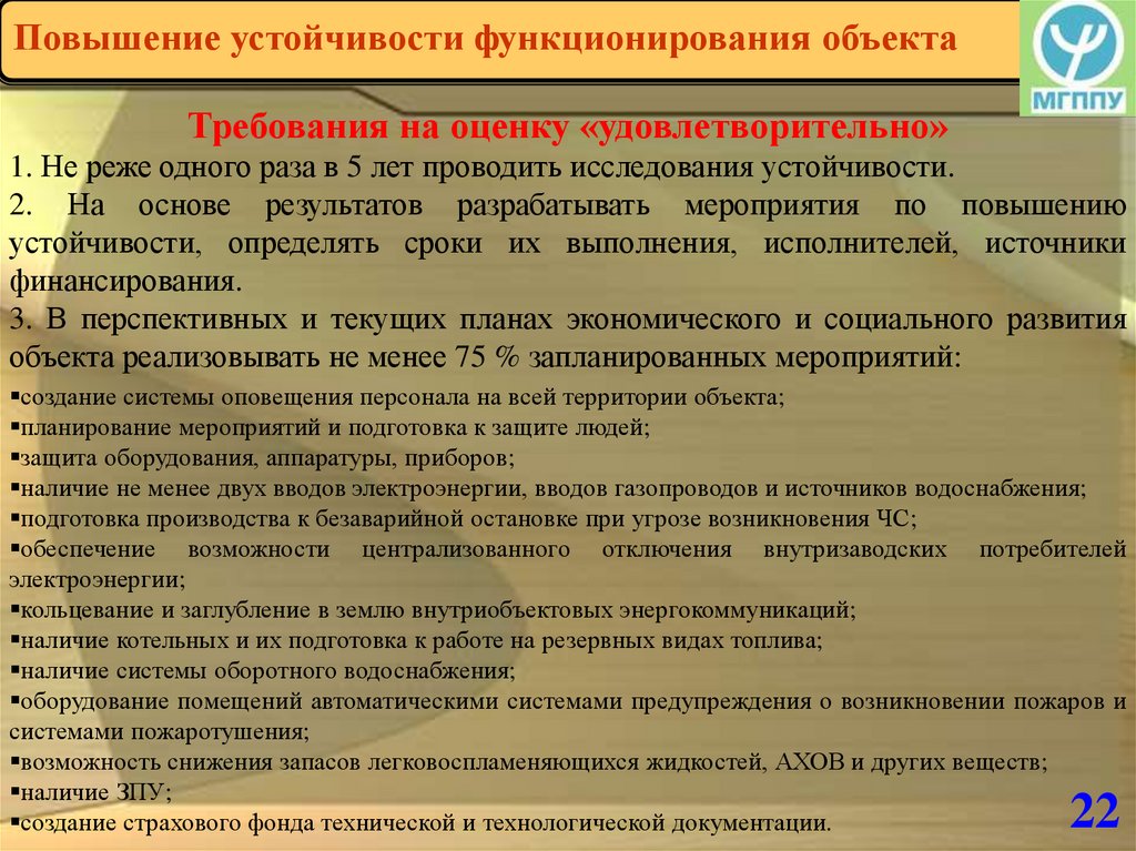 Повышение устойчивости функционирования объектаТребования на оценку «удовлетворительно»
