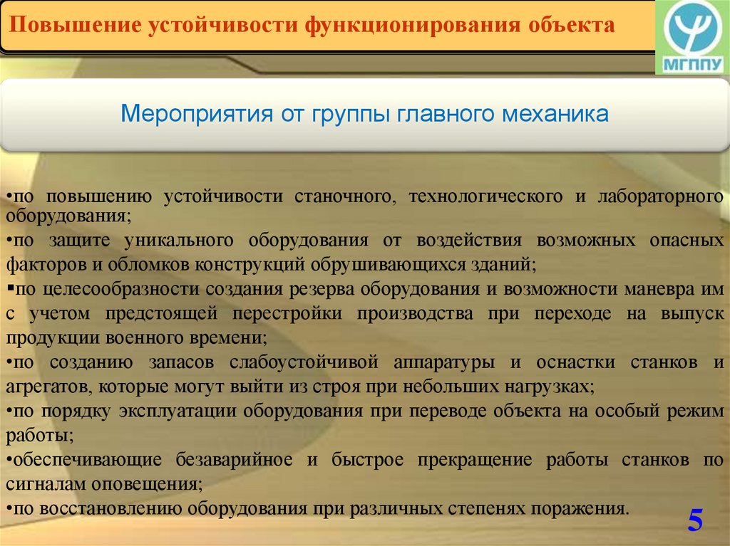 Повышение устойчивости функционирования объектаМероприятия от группы главного механика