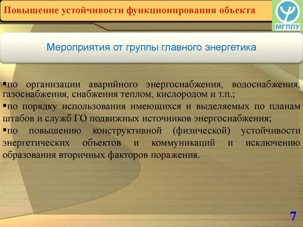 Повышение устойчивости функционирования объектаМероприятия от группы главного энергетика