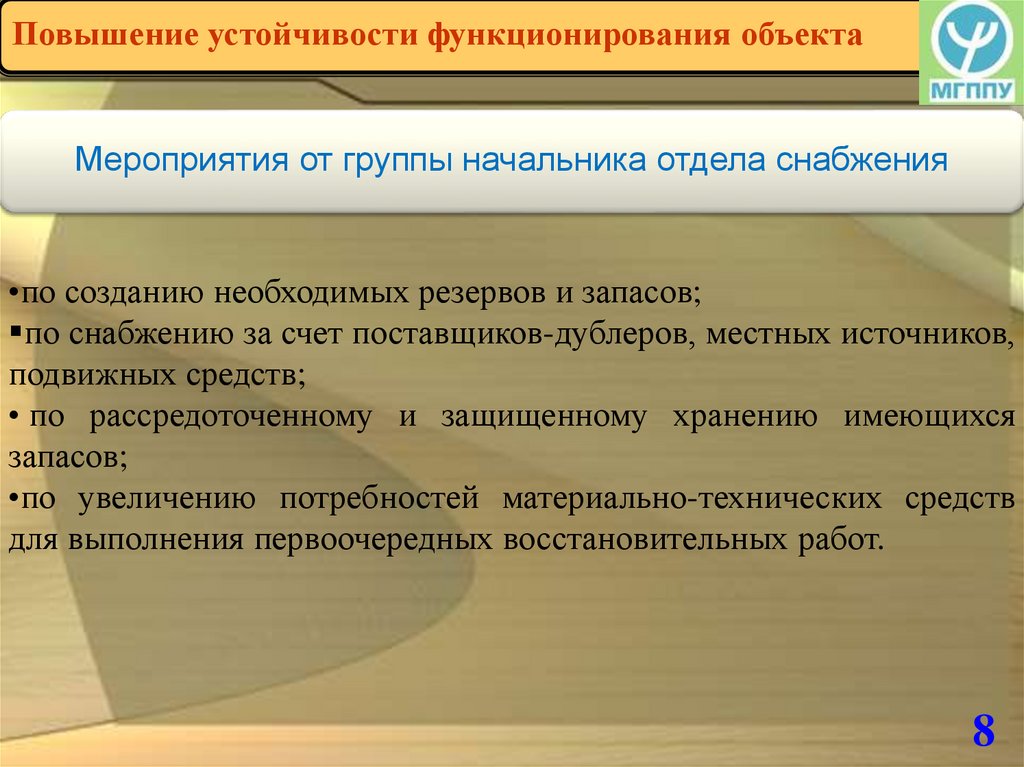 Повышение устойчивости функционирования объектаМероприятия от группы начальника отдела снабжения