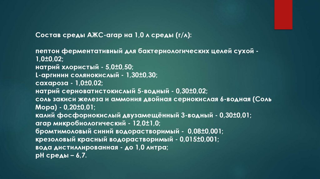 Состав среды АЖС-агар на 1,0 л среды (г/л):пептон ферментативный для бактериологических целей сухой 1,0±0,02;