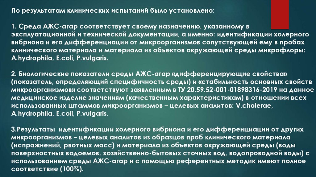 По результатам клинических испытаний было установлено:1. Среда АЖС-агар соответствует своему назначению, указанному в