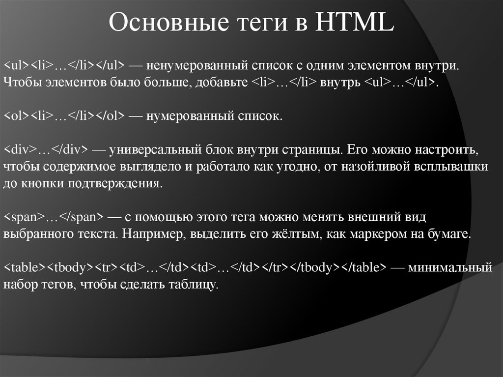 Основные теги в HTML<ul><li>…</li></ul> — ненумерованный список с одним элементом внутри.