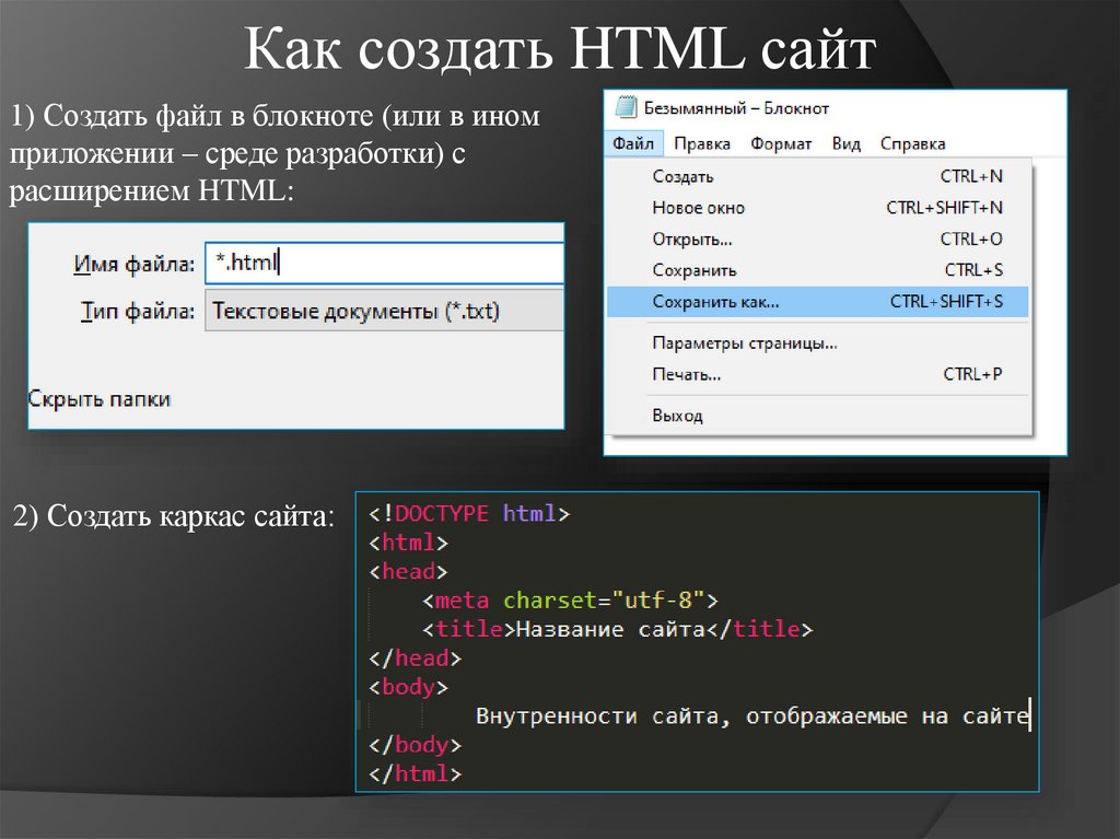 Как создать HTML сайт1) Создать файл в блокноте (или в ином
