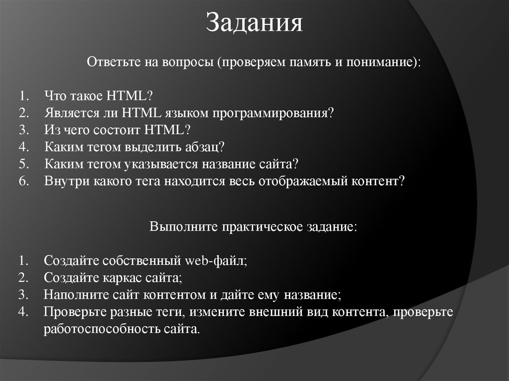 ЗаданияОтветьте на вопросы (проверяем память и понимание):
