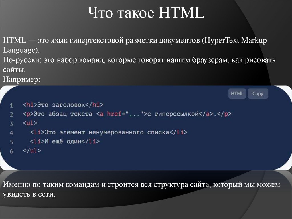 Что такое HTMLСлова внутри угловых скобок называются тегами: <h1>,<p> и т. д.