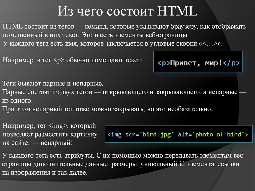 Из чего состоит HTMLHTML состоит из тегов — команд, которые указывают браузеру, как отображать