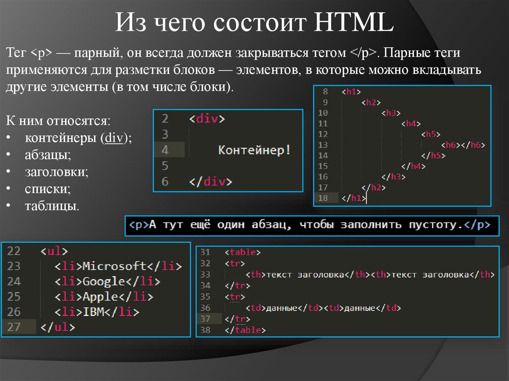 Из чего состоит HTMLТег <p> — парный, он всегда должен закрываться тегом </p>. Парные теги