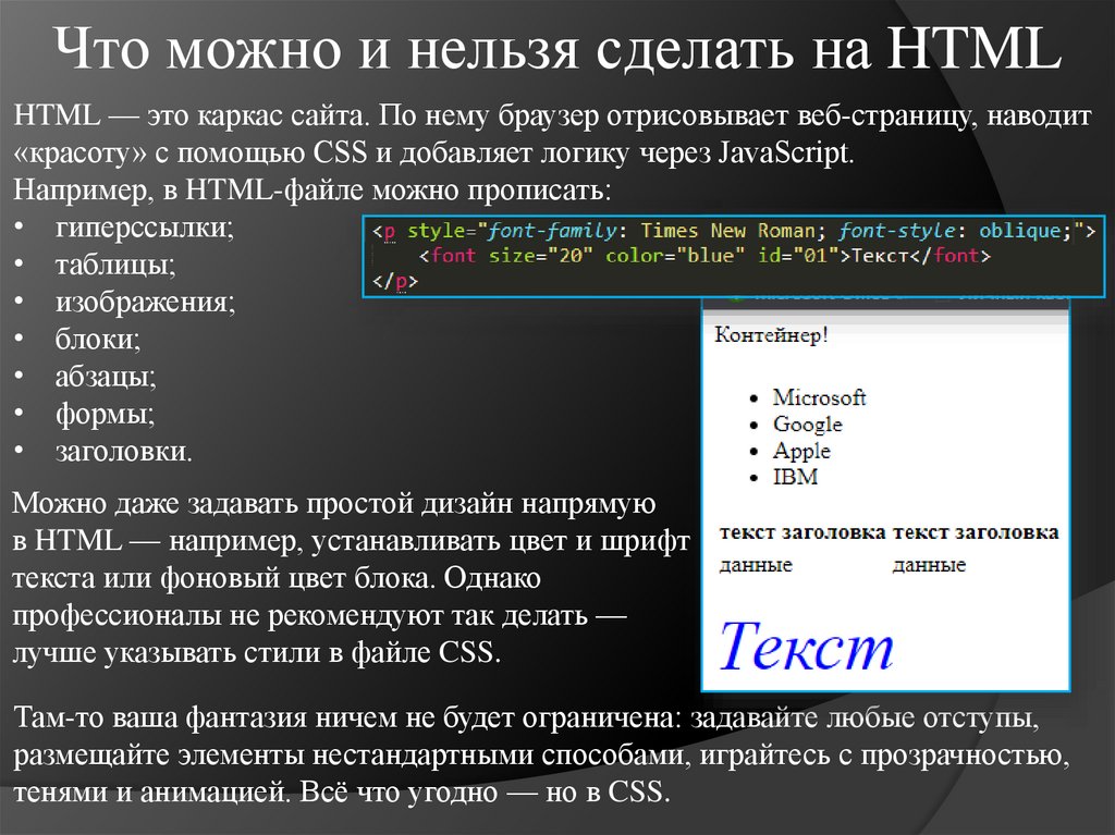 Что можно и нельзя сделать на HTMLHTML — это каркас сайта. По нему браузер отрисовывает веб-страницу, наводит