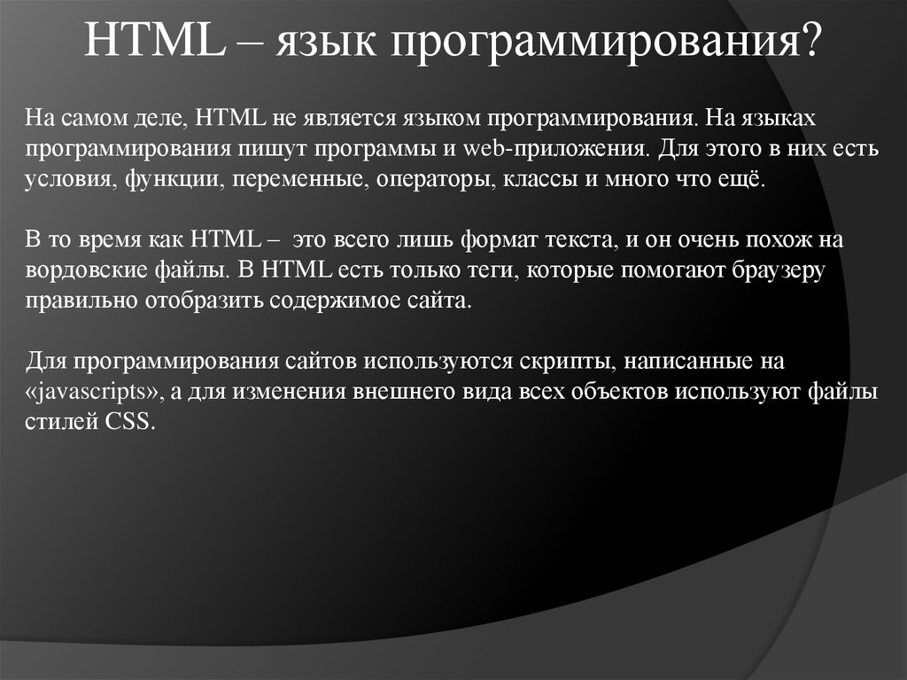 HTML – язык программирования?На самом деле, HTML не является языком программирования. На языках