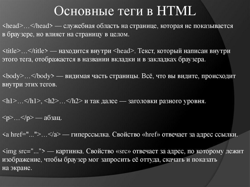 Основные теги в HTML<head>…</head> — служебная область на странице, которая не показывается