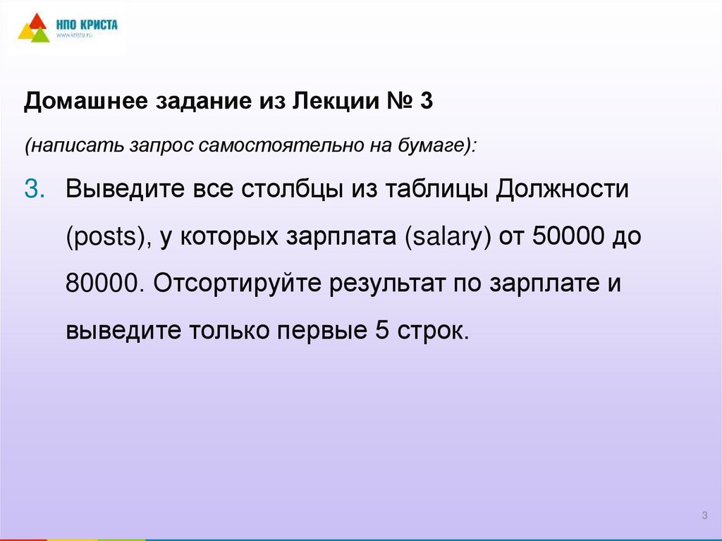 Домашнее задание из Лекции № 3(написать запрос самостоятельно на бумаге):