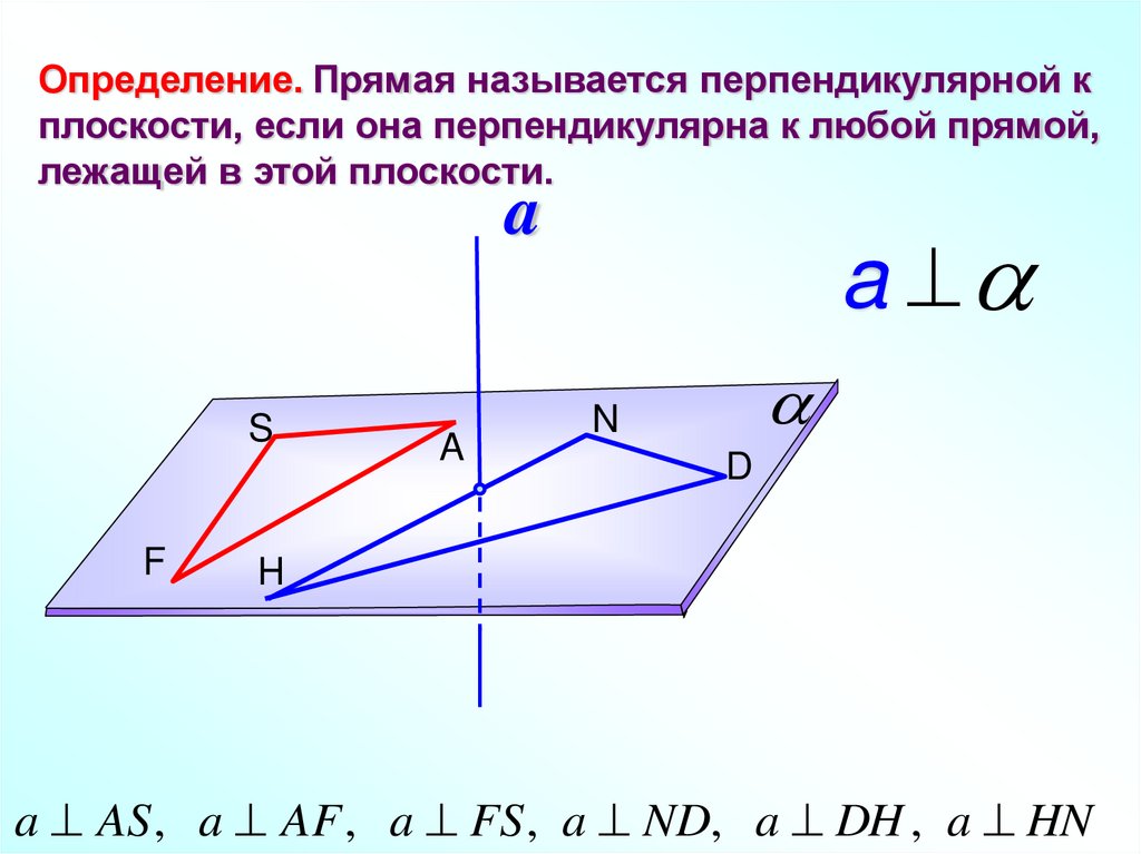 Определение. Прямая называется перпендикулярной кплоскости, если она перпендикулярна к любой прямой,