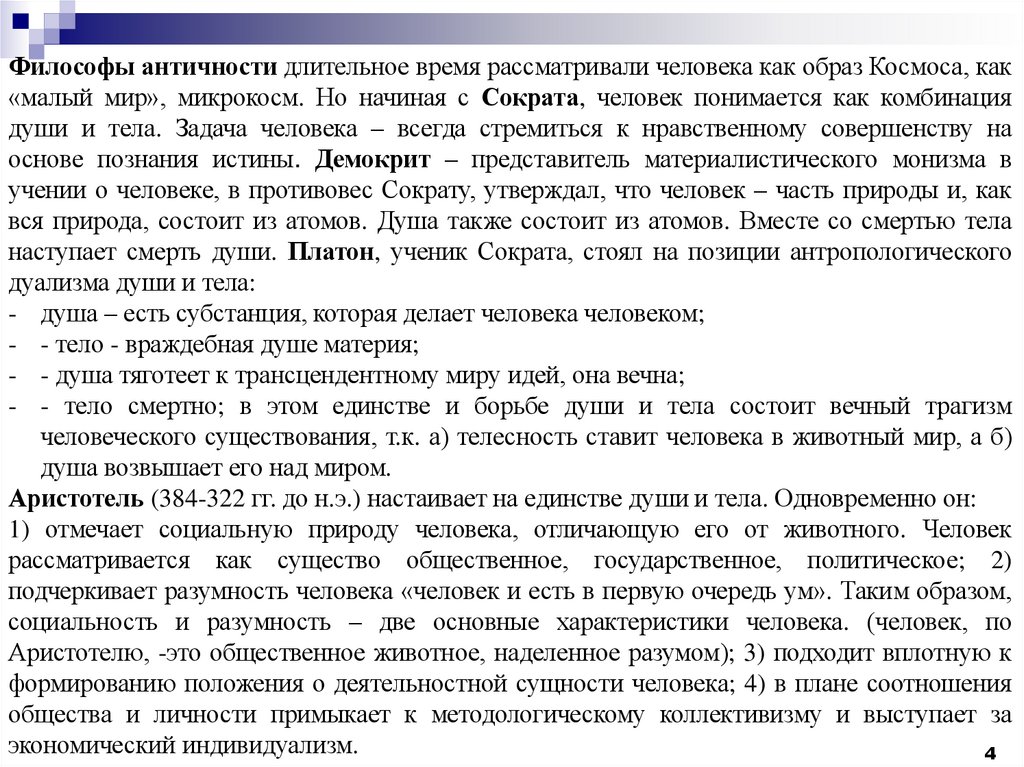 Философы античности длительное время рассматривали человека как образ Космоса, как«малый мир», микрокосм. Но начиная с Сократа, человек понимается как комбинация