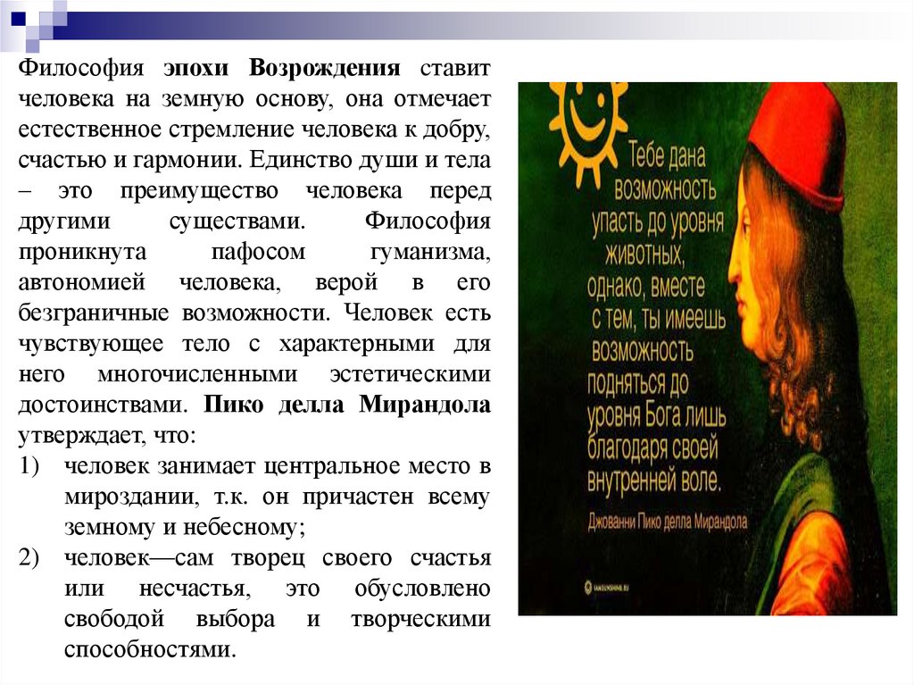 Философия эпохи Возрождения cтавитчеловека на земную основу, она отмечает