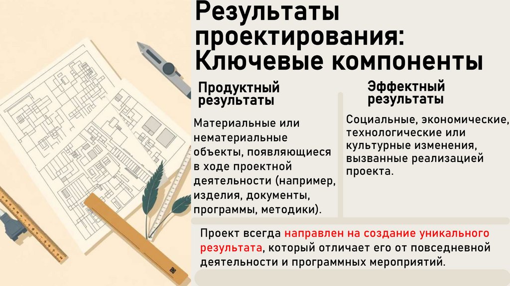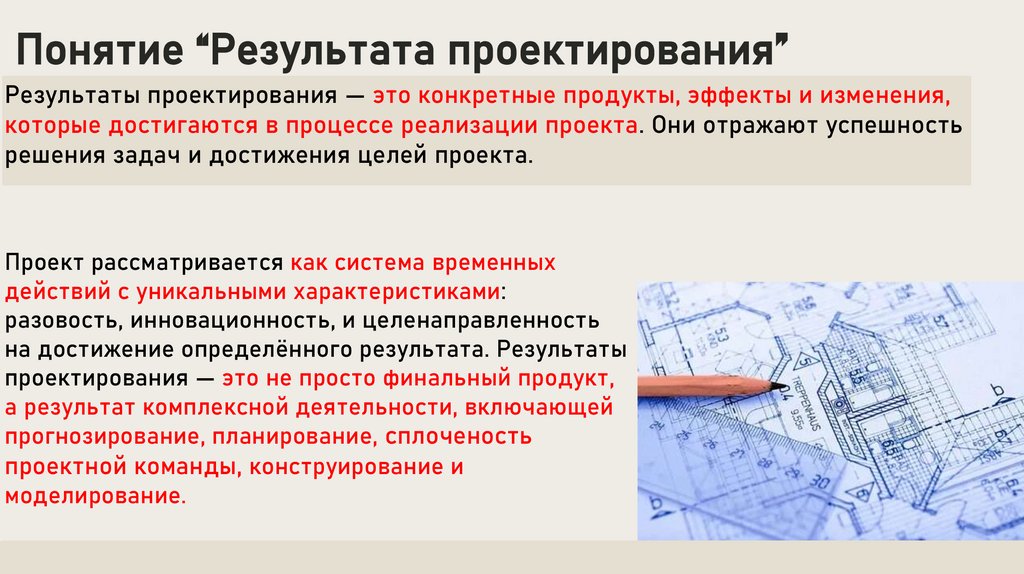 Понятие “Результата проектирования”Результаты проектирования — это конкретные продукты, эффекты и изменения,