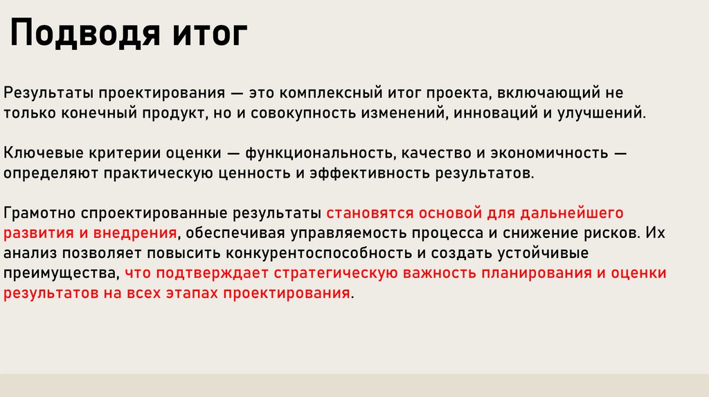 Подводя итогРезультаты проектирования — это комплексный итог проекта, включающий не
