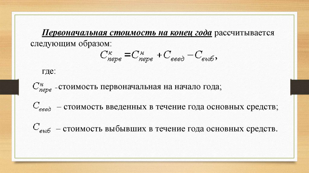 Первоначальная стоимость на конец года рассчитываетсяследующим образом:
