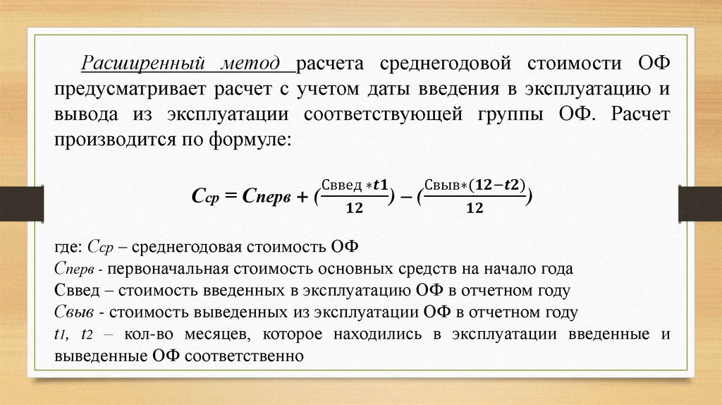 Расширенный метод расчета среднегодовой стоимости ОФпредусматривает расчет с учетом даты введения в эксплуатацию и