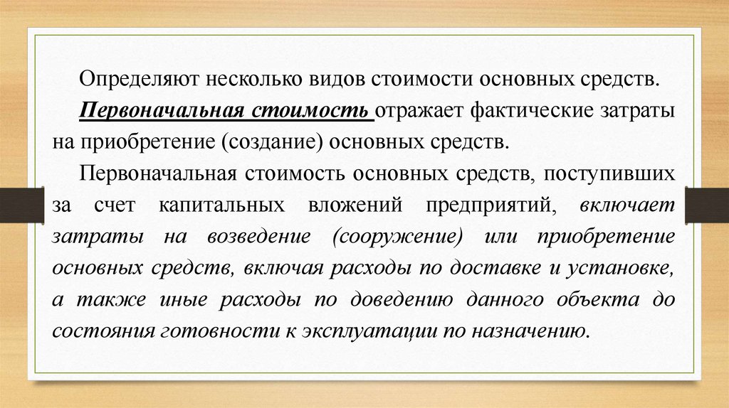 Определяют несколько видов стоимости основных средств.Первоначальная стоимость отражает фактические затраты